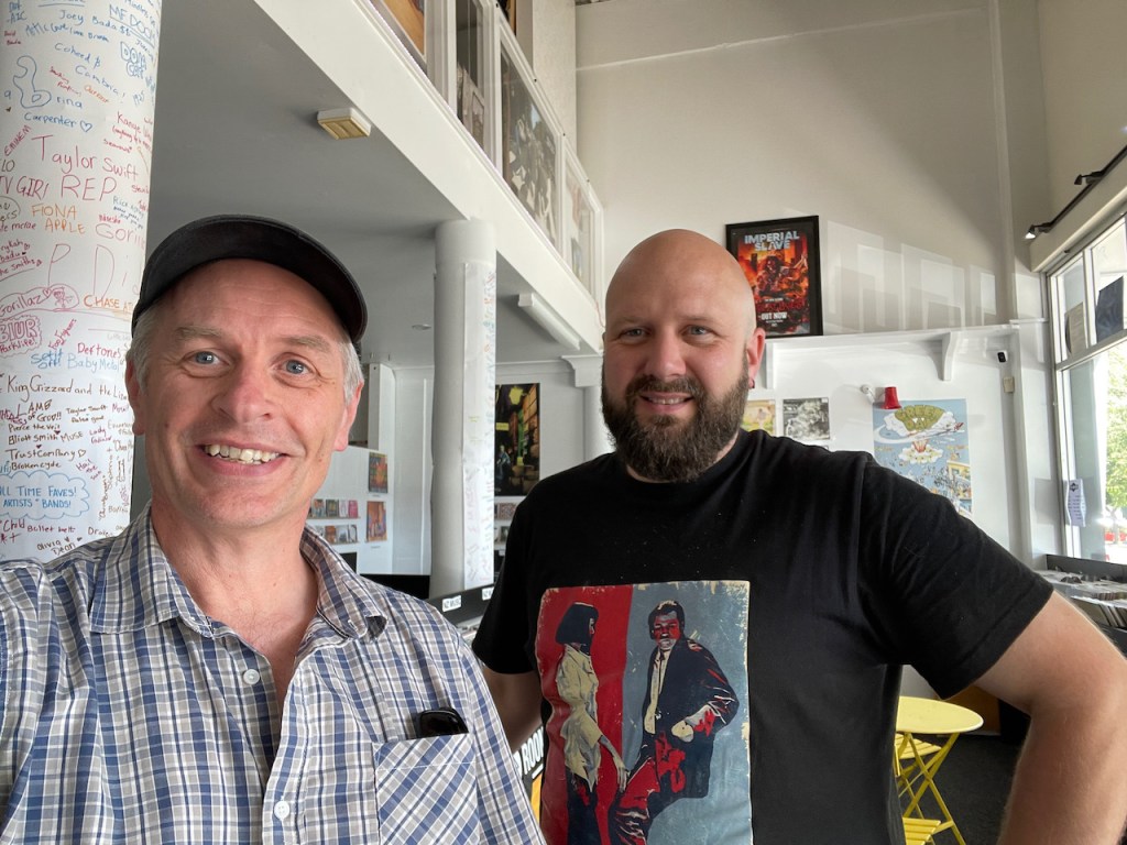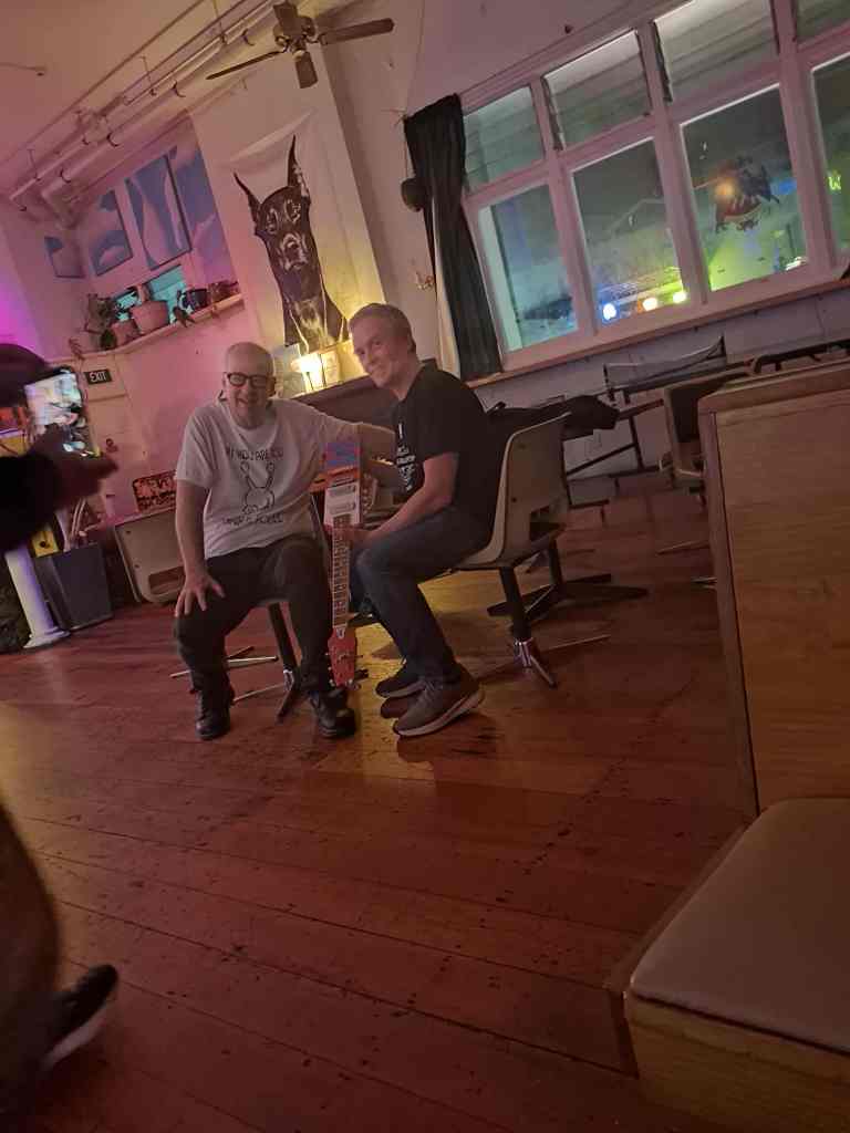 Roughly a thousand years later (2025) I saw an ad saying that King Missile would be playing in Masterton and Whanganui. Thinking it was a joke I almost didn’t look into it further, but you know what? It wasn’t a joke, and here’s a photo of me with guitarist Dogbowl, holding his Devo-style Eastwood guitar at Porridge Watson’s to prove it!